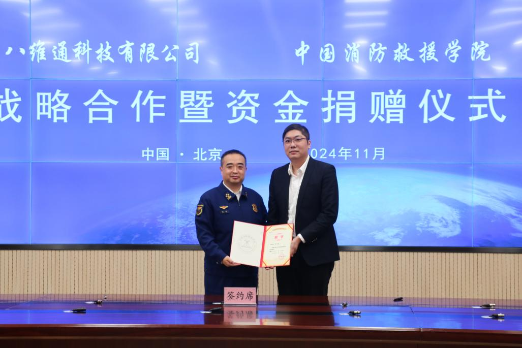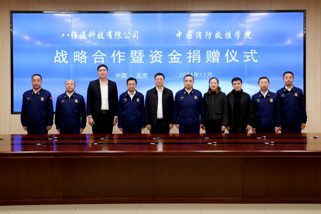 11月22日,八維通科技有限公司與中國消防救援學院戰略合作暨資金捐贈儀式在北京舉行。中國消防救援學院黨委書記沈宇、院長閆勝利、黨委副書記郭富偉及相關部門負責人,八維通科技有限公司董事長楊宏旭、總經理余華瓊、首席數字官鄭航等領導共同出席儀式。