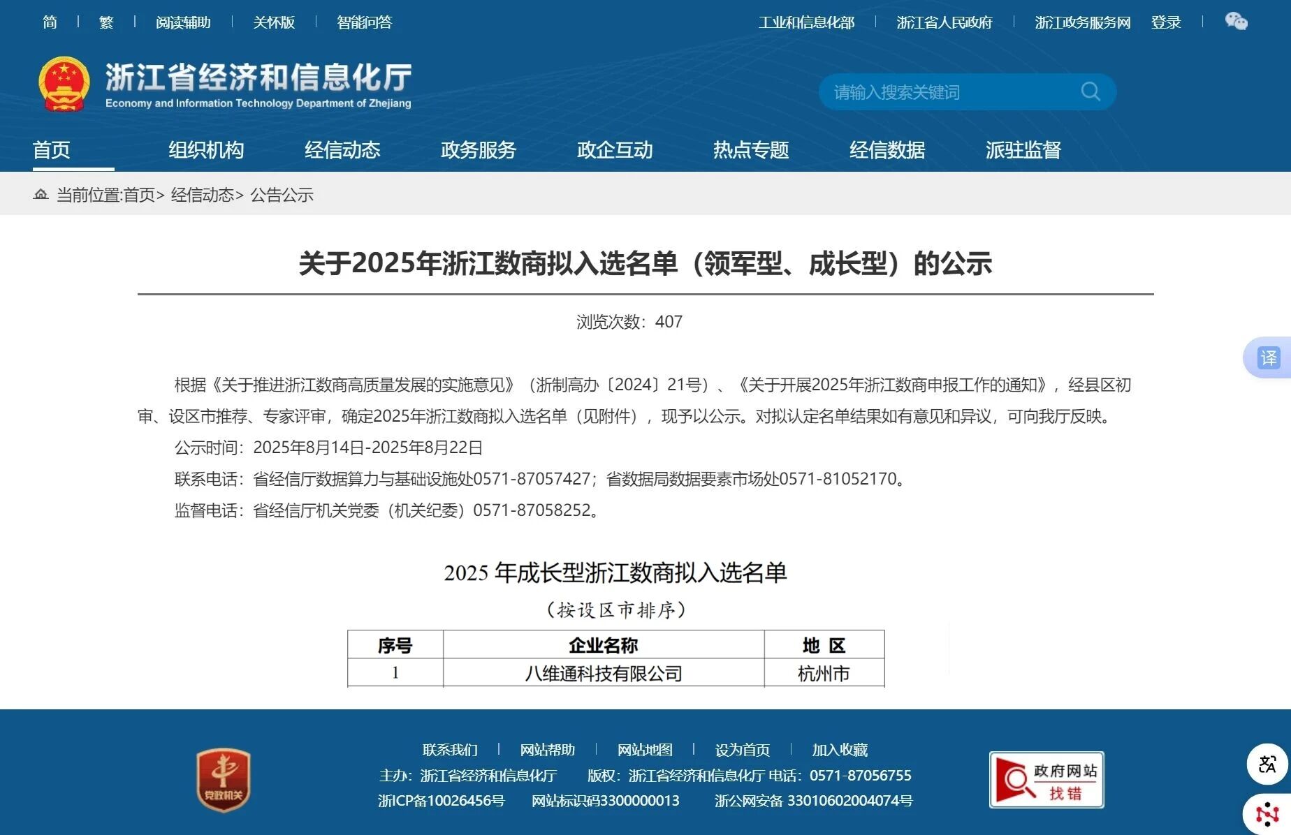 近日,浙江省經濟和信息化廳正式公示了2025年浙江數商擬入選名單,八維通科技有限公司憑借在數字領域的創新實力與成長潛力,成功入選成長型“浙江數商”名單。