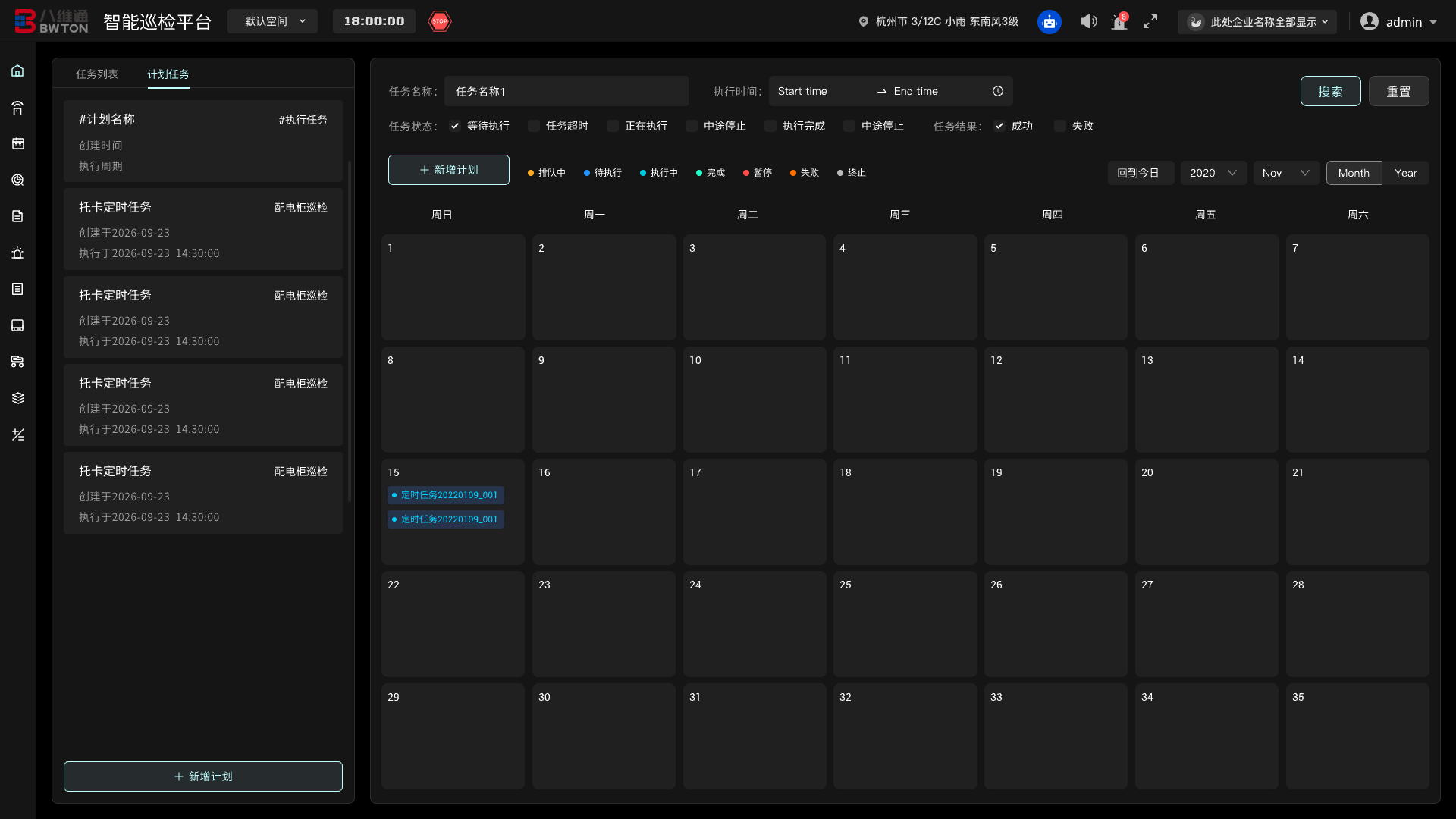 任務(wù)自動化是實現(xiàn)無人化作業(yè)的關(guān)鍵。通過將巡檢策略封裝為可復(fù)用的“任務(wù)模板”,并綁定到可視化的“任務(wù)計劃”日歷中。實現(xiàn)“一次配置,長期自動執(zhí)行”的目標(biāo)。系統(tǒng)會根據(jù)預(yù)設(shè)的周期和規(guī)則,自動喚醒、調(diào)度載具完成巡檢。