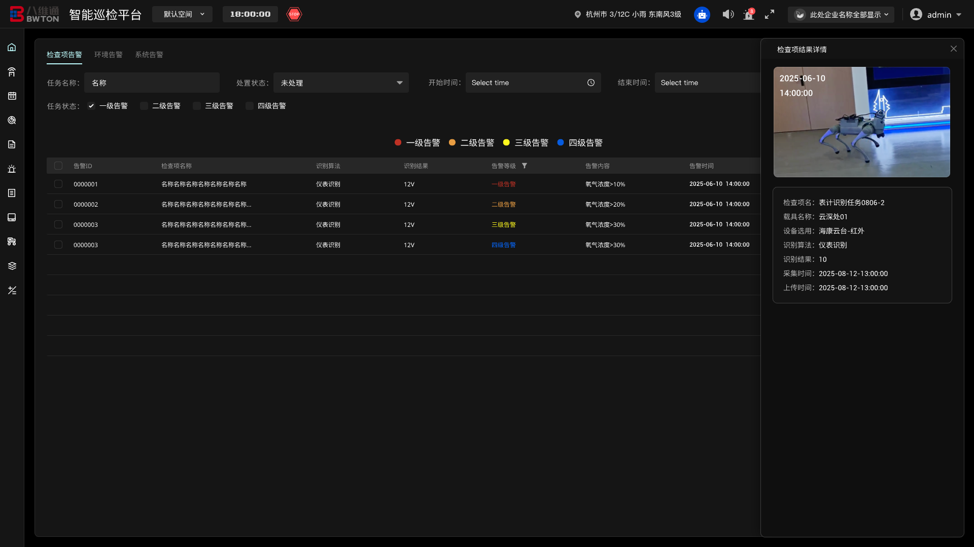 態(tài)勢羅盤是面向管理決策者與調(diào)度員的數(shù)據(jù)駕駛艙。將巡檢業(yè)務(wù)中的四大核心要素——任務(wù)、告警、工單、載具——在數(shù)字孿生地圖上進(jìn)行空間化、可視化呈現(xiàn)。實時洞察全局態(tài)勢,快速識別風(fēng)險高發(fā)區(qū)。